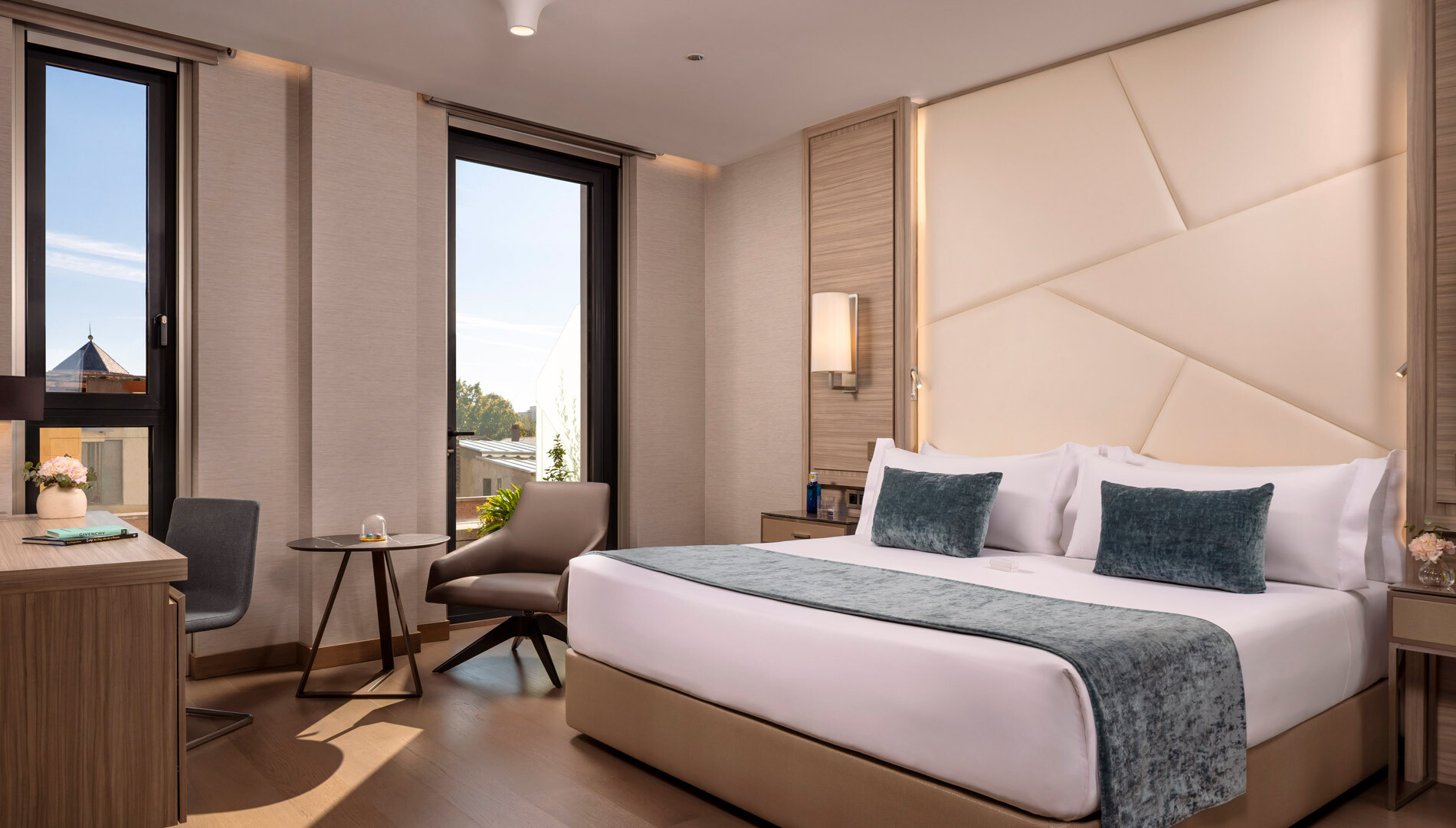 Situadas en las plantas séptima, novena y undécima, nuestras habitaciones Superiores con Terraza ofrecen un refugio singular donde el interior dialoga con el exterior. Desde su terraza privada, las vistas se abren al histórico distrito de los Austrias, invitando a contemplar Madrid desde una perspectiva íntima y privilegiada. Un espacio pensado para la pausa y la desconexión, donde la comodidad contemporánea y la elegancia serena se unen para crear una experiencia de calma absoluta en pleno corazón de la ciudad.