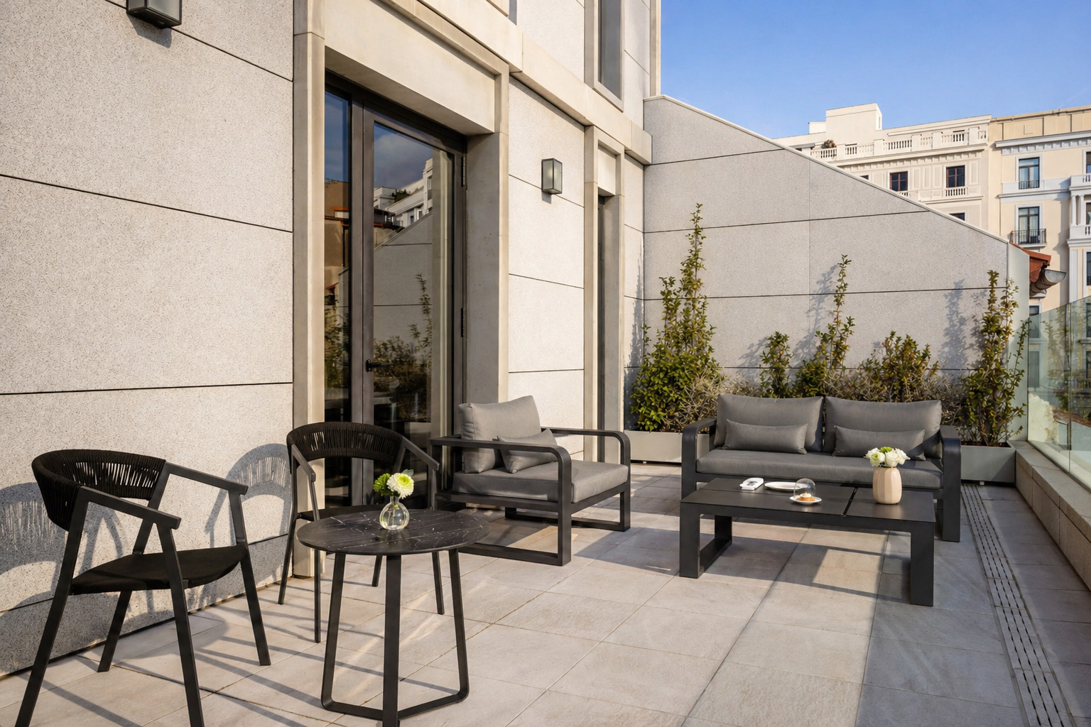 Nuestras Junior Suites con Terraza ofrecen una experiencia privilegiada con vistas abiertas al histórico Madrid de los Austrias desde su terraza privada. Situadas en las plantas séptima, novena y undécima, ofrecen espacios amplios y luminosos, donde el interior y el exterior se integran con naturalidad, creando un ambiente sereno y sofisticado. Un refugio exclusivo pensado para disfrutar de la ciudad con privacidad, confort y una elegancia atemporal.